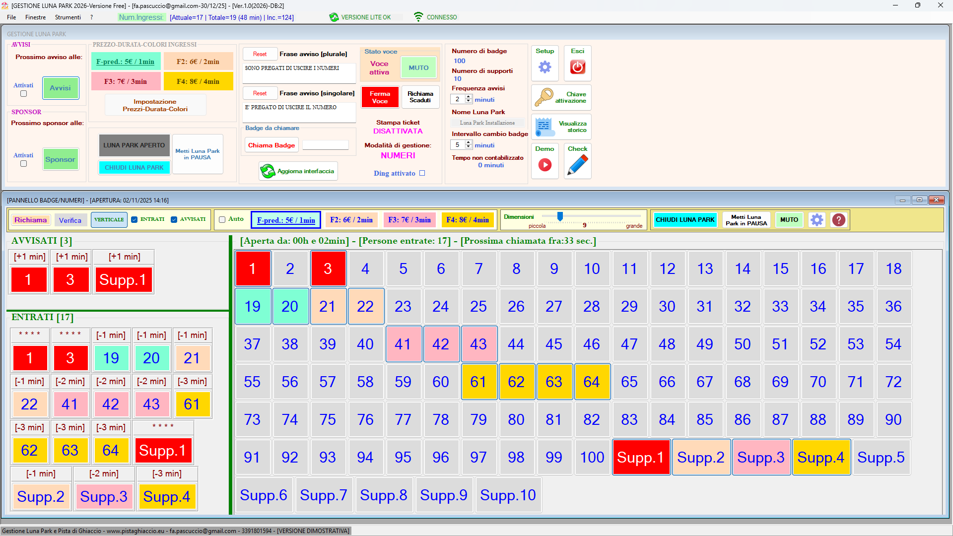 Con un semplice click il Badge entra in pista e si avvia in automatico il suo cronometro. Allo scadere del tempo verrà richiamato in automatico dal computer con voce fluente. Con un altro semplice click il Badge esce dalla pista. In ogni momento si ha un quadro completo dei badge In Pista e di quelli Scaduti. Possibilità di impostare la cancellazione automatica dei dati di ingresso ogni giorno.