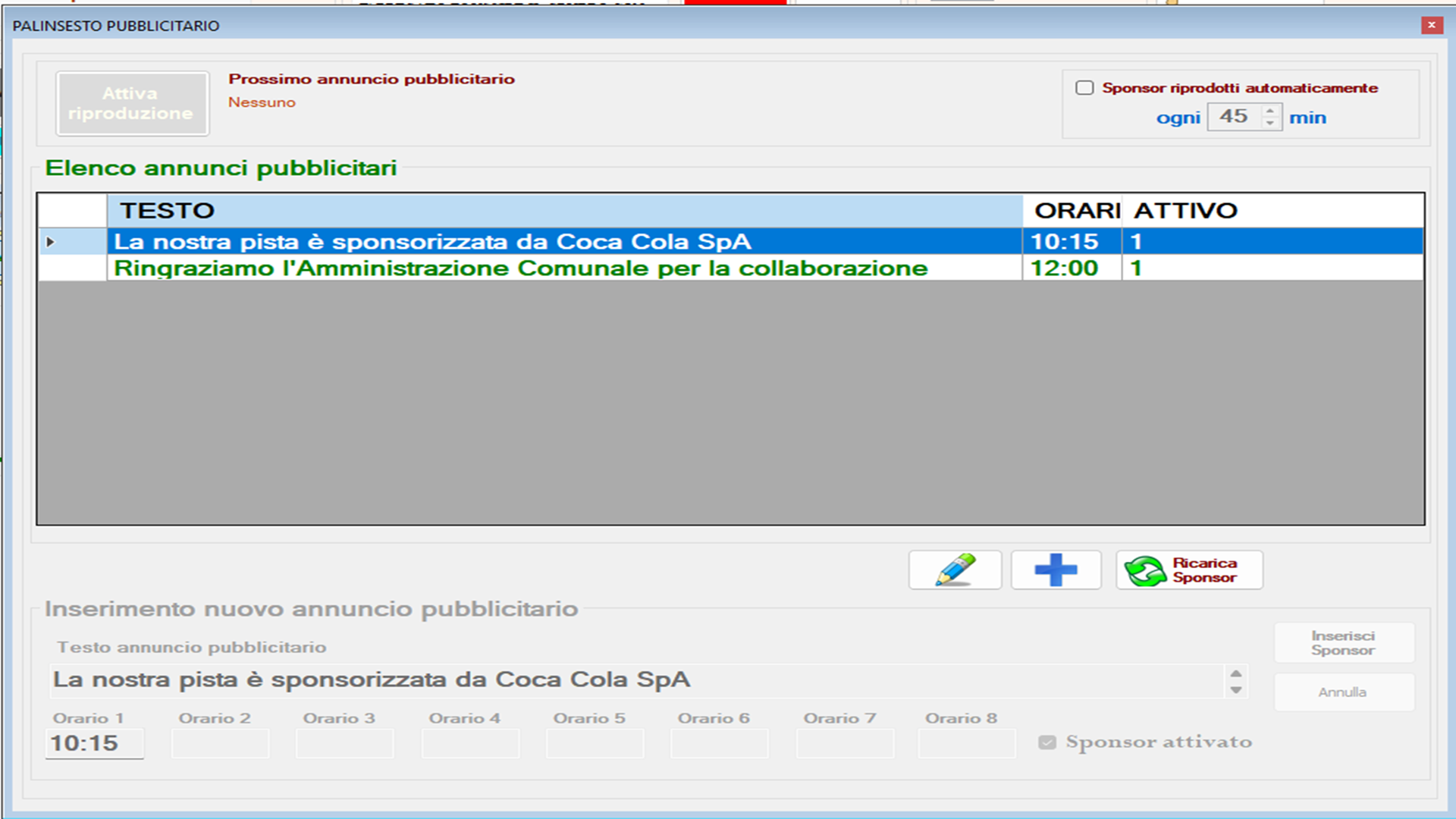 Gestione automatica degli Sponsor mediante annunci vocali riprodotti dal computer ad orari prestabiliti oppure casualmente.